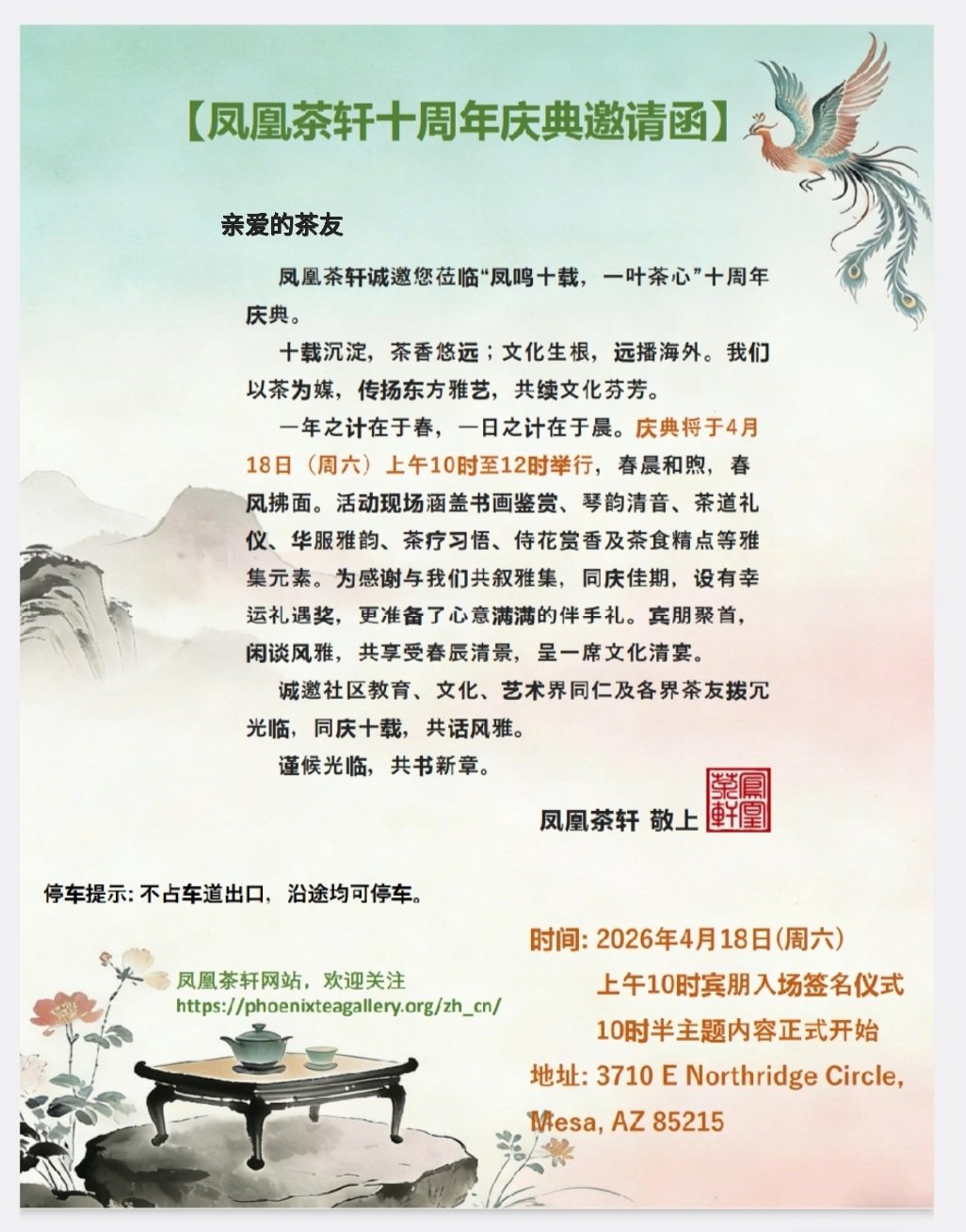 很高兴告诉并邀请凤凰茶轩茶友们,十周年庆典活动在最美人间四月天举办,同时也考虑凤凰城的天气情况特择春日晨光,园林清景,闲谈风雅。我们认真用心举办一场具有中华文化的精品活动,在这一盏中国味道里,找到属于我们的文化自信,您的出席就是对所有工作人员的付出最好肯定!